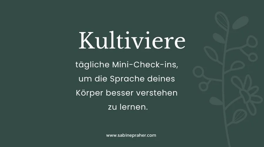 Das schaffst du, indem du immer wieder – am besten mehrmals täglich - einen kleinen, ehrlichen Check-in mit deinem Körper machst – dazu gehe ich nachher noch ins Detail.